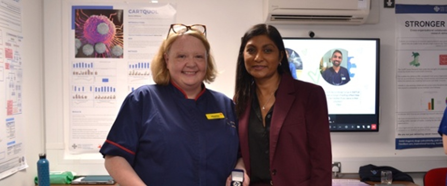 Ar ei hymweliad â Gwasanaeth Canser Felindre, cyflwynodd Prif Swyddog Nyrsio Cymru, Sue Tranka, Wobr Rhagoriaeth y Prif Swyddog Nyrsio i Bennaeth Heintiau, Atal a Rheoli (IPC) Hayley Harrison Jeffreys.